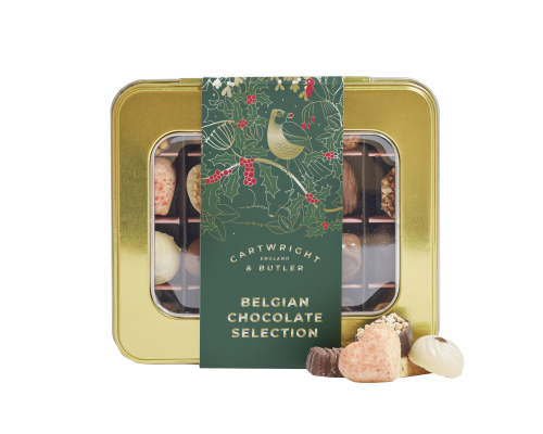 A selection of fine, dark and milk chocolates in a gold Christmas tin. Perfect for gifting this Christmas or to take to a dinner party as an after dinner treat.